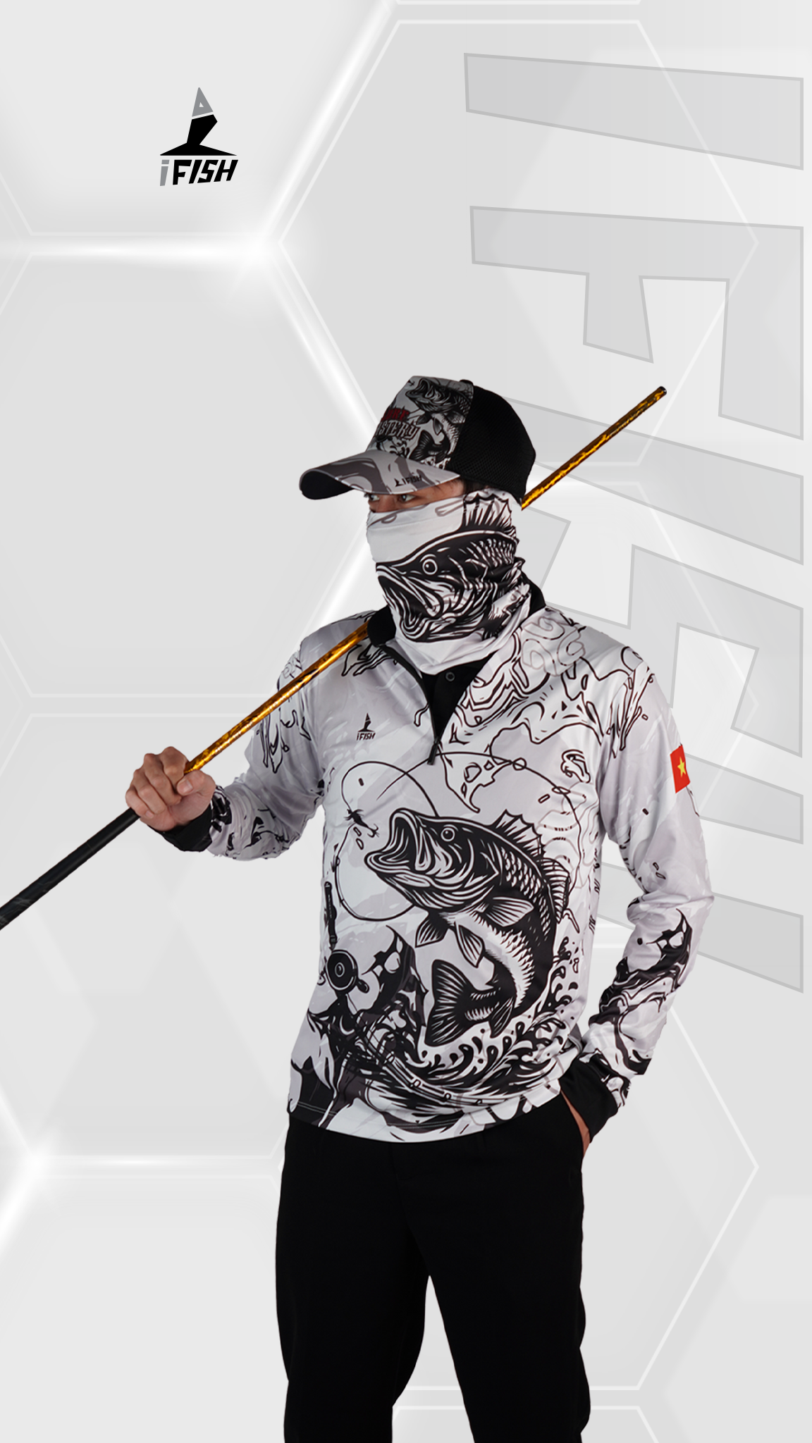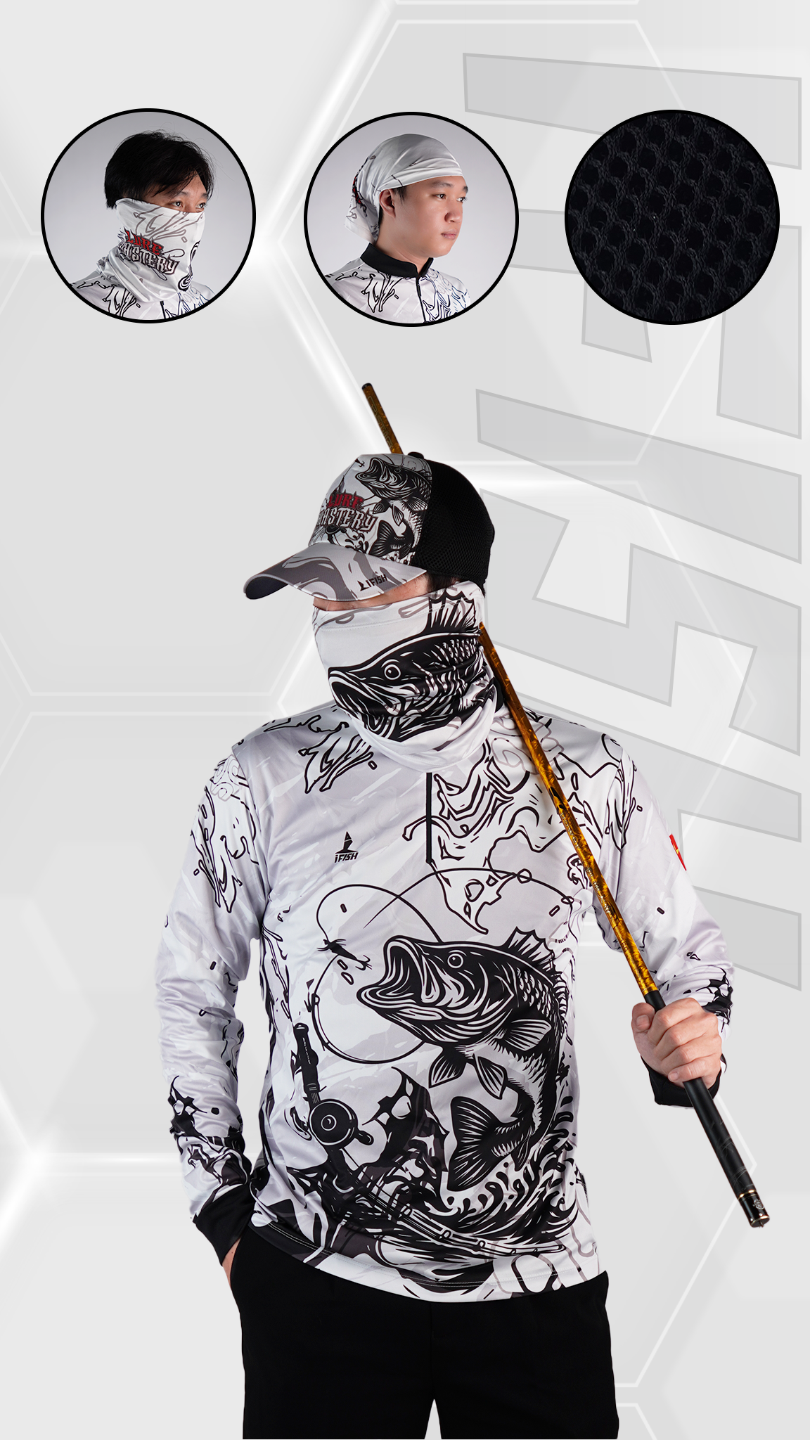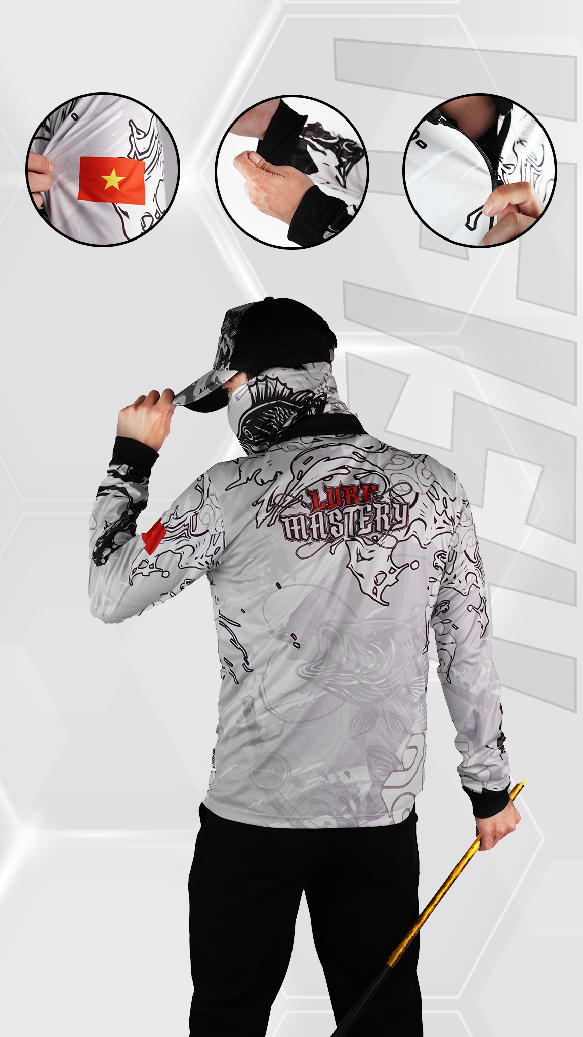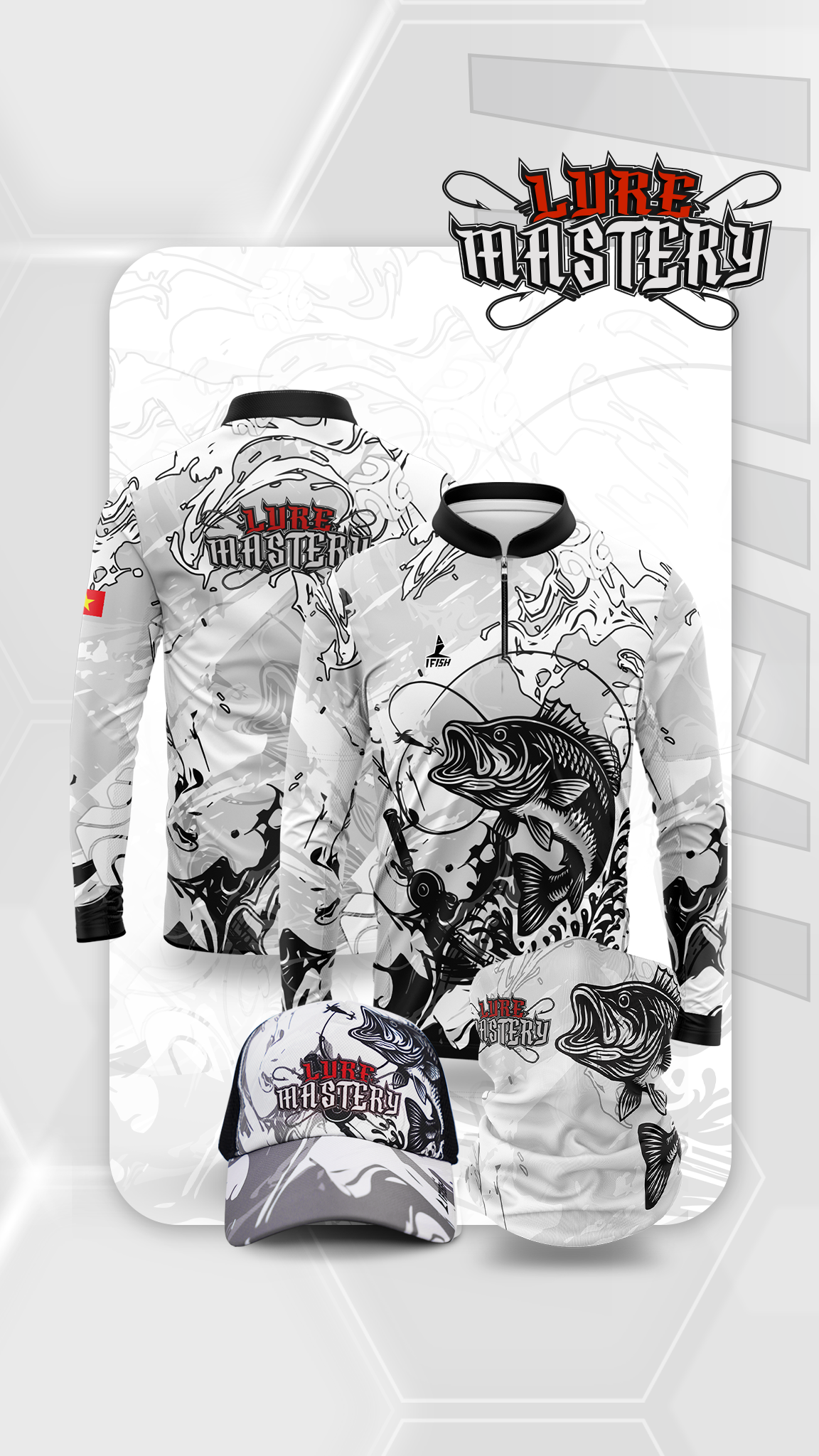 Thiết kế nổi bật với tông trắng – đen tương phản, họa tiết cá săn mồi sắc nét, mang đậm phong cách nghệ thuật và chiều sâu chiến thuật. LURE MASTERY không phô trương, nhưng đủ để anh em nổi bật giữa mặt nước.